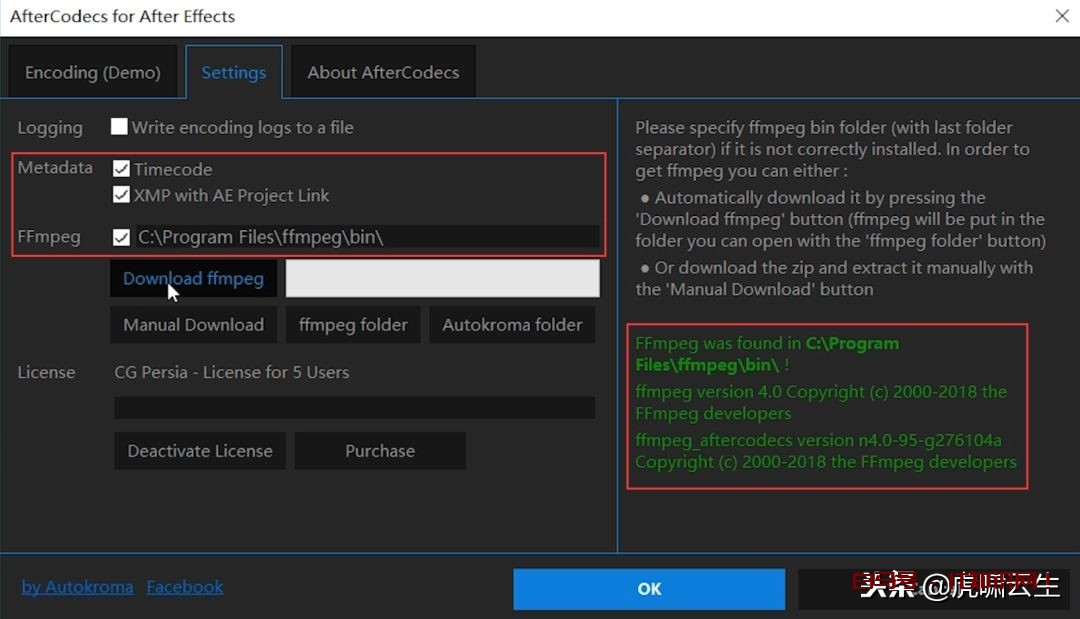 将Metadata全部勾上,FFmpeg也勾上,此选项勾上之后需要点击Download FFmpeg,直到右侧红框内文字变为绿色。