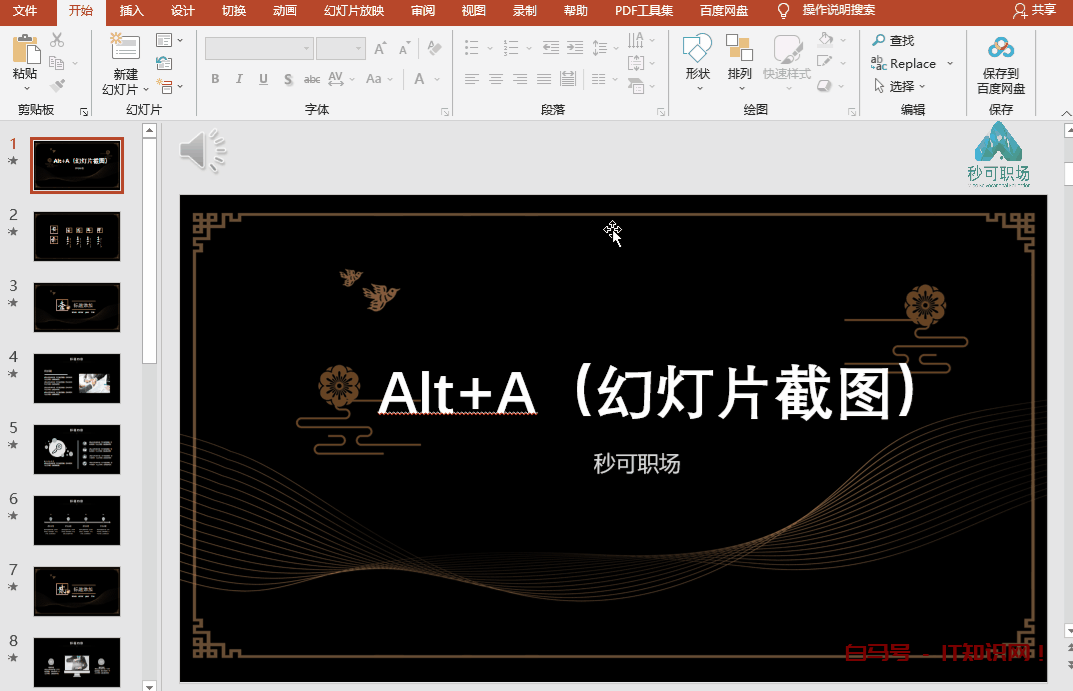 当需要对PPT中某个页面进行截图保存时,只需一键【Alt+A】即可!