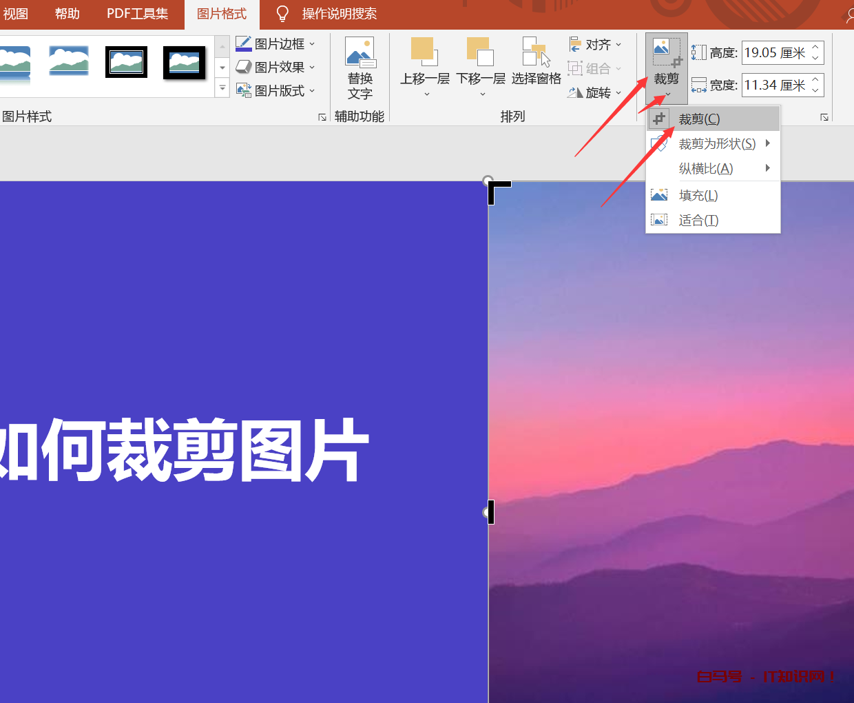 拖动的控点我们就可以来拖动他来裁剪图片,也是非常的方便,还有一种方法就是去裁剪工具单击下拉格选择——纵横比16:9我们就可以将这个图片裁剪为适合我们幻动片全图铺满的这样一个尺寸了。我们也可以将它裁剪为个性化的图形,比如说,我们单击裁剪——裁剪为形状——(随便一个形状——纵横比1:1)也可以移动图片,截取我们想要的那部分图片。