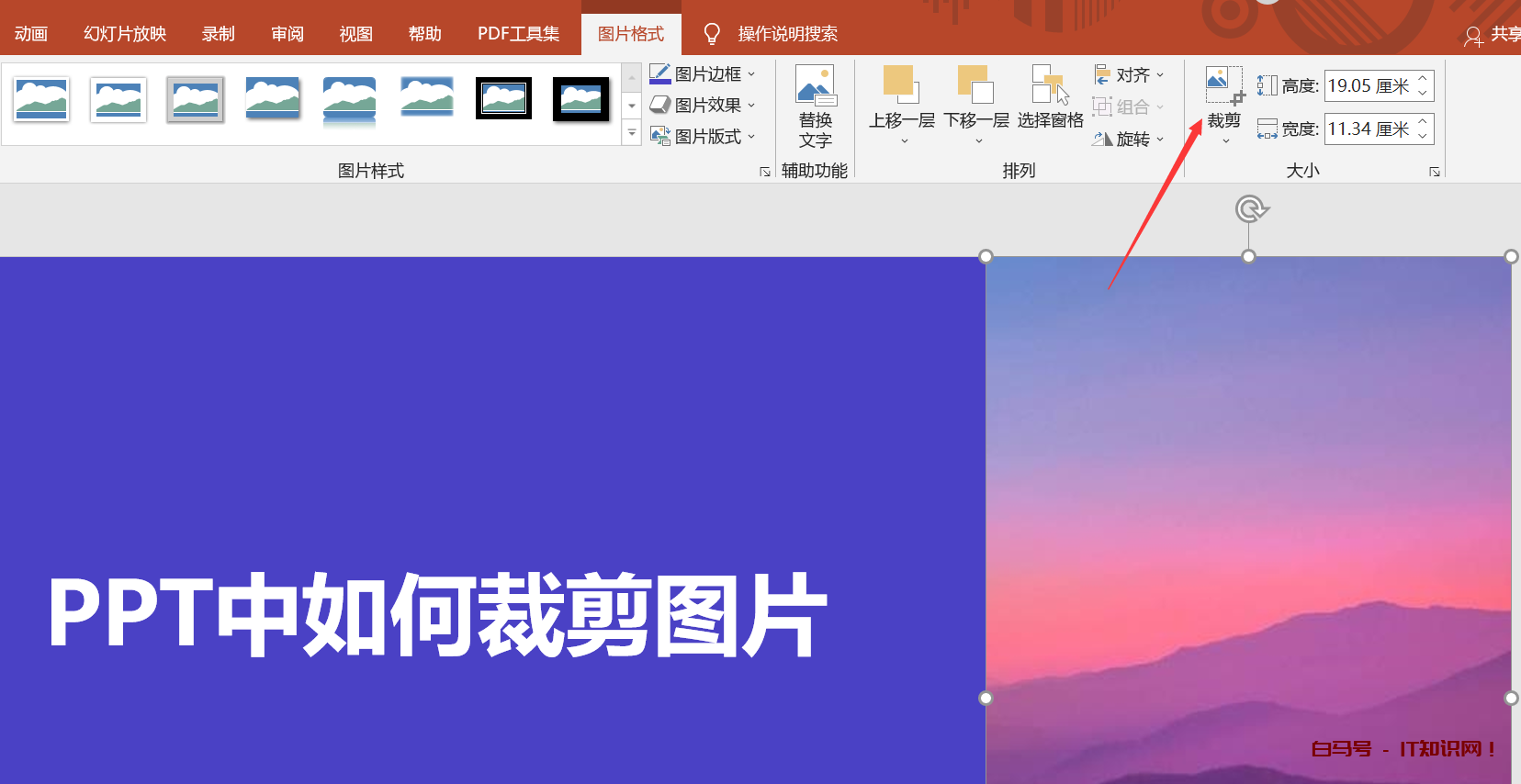 当我们把图片放到PPT中之后,那么双击图片——此时在PPT的右上方就会出现裁剪这个工具,接下来我们直接单击裁剪在图片的四周会出现可以拖动的控点,如下图所示。