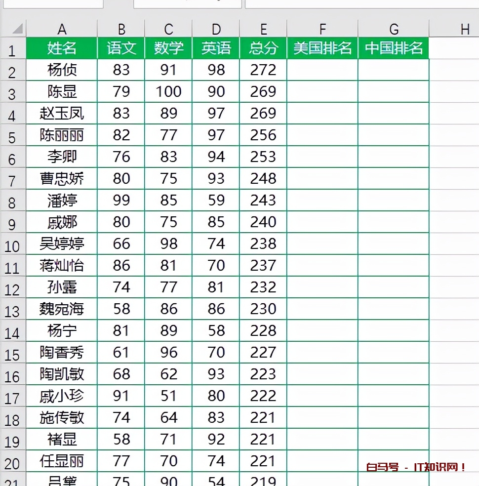 将F2单元格公式下拉填充到底即可完成美国式排名。(ps:观看F3:F5单元格就会发现美国式排名的特点,当有两个总分一样时,会并列第2名,但是紧接着就是第4名,没有第三名)