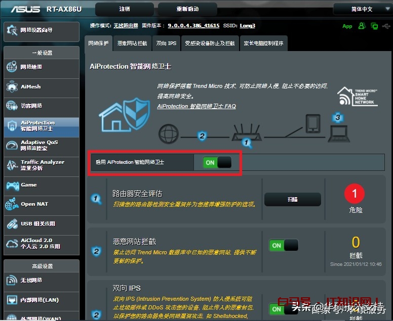 若你的路由器有AiProtection智能网络卫士功能,请启用此功能,可以更进一步的保护路由器本身及区域网络内的设备,