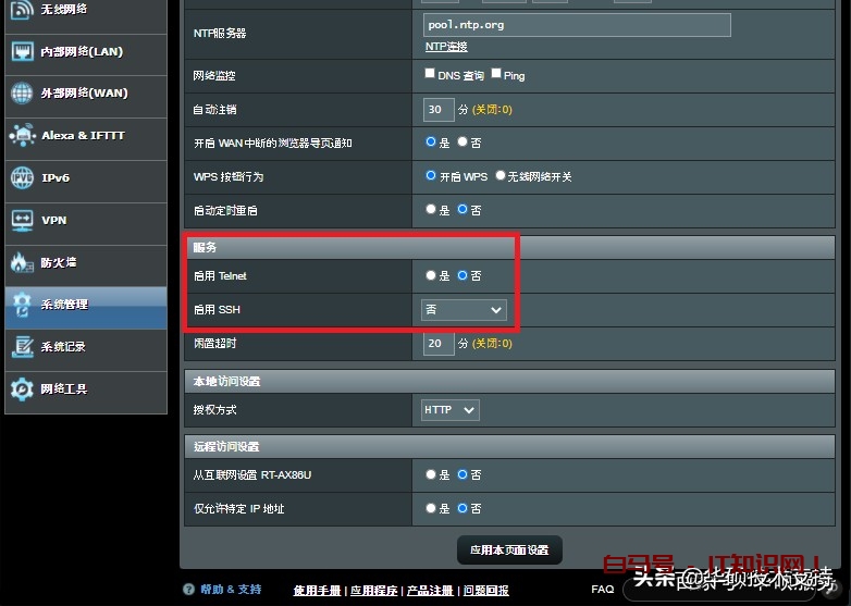 Telnet 及 SSH 可以让你直接使用Linux 命令来控制路由器,这个功能预设关闭,如无特殊需求请勿打开此功能。