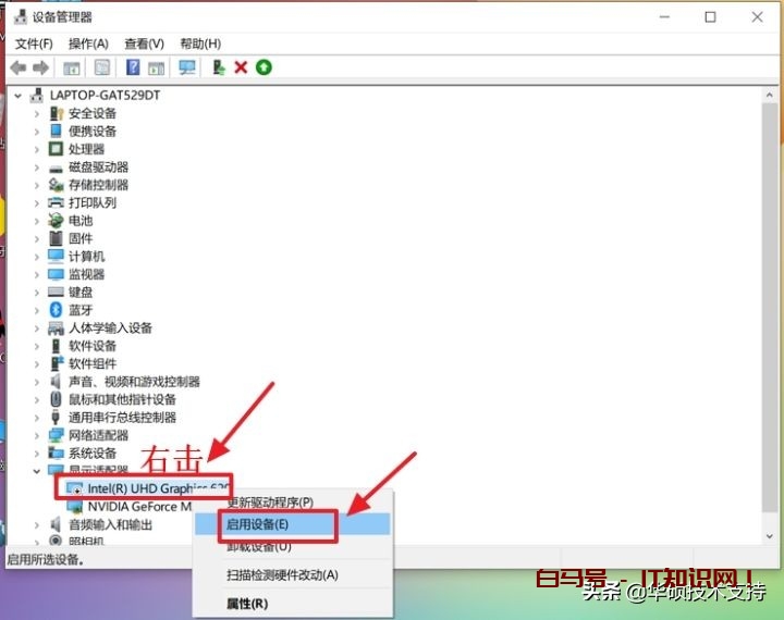 这时请由【设备管理器】–显示适配器–集成显示卡(如intel集成显卡)–右键点击–【启用设备】重新启用。