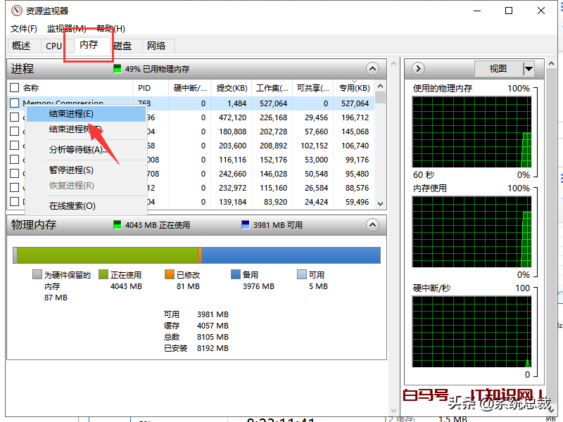 3.切换至运行内存选项卡,右键不用的程序,点一下结束进程