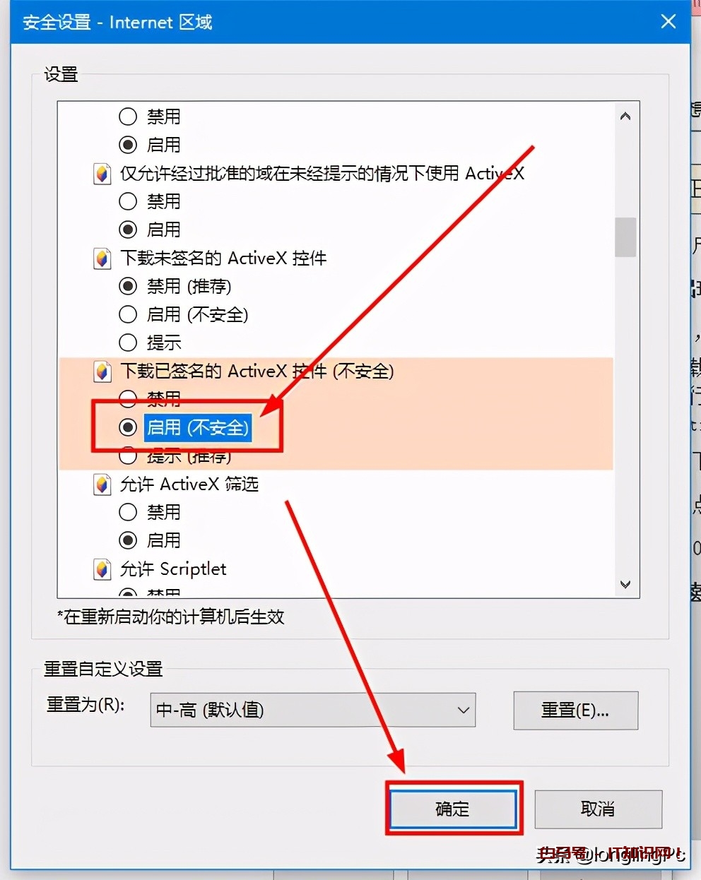 选择“下载未签名的ActiveX控件”,并设置成为“启用”,然后点击“确定”按钮;