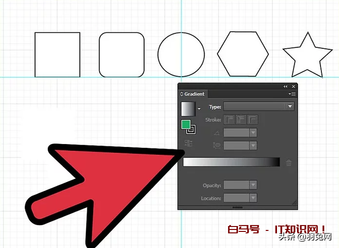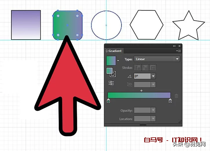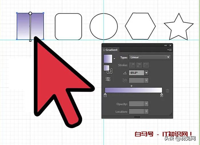 6、在第一个形状上进行第一个渐变混合。在渐变面板上,将丁香色样本拖动到色标以更改黑色。然后选择正方形,然后单击渐变填充框。要更改渐变的方向,请在键盘上单击“ G”,按住Shift键并向上拖动指针。正方形会出现白色到淡紫色的渐变。