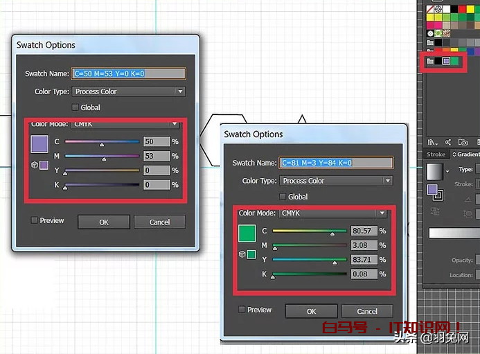 4、创建两个新的色板。将颜色设置为以下组合:丁香色:C = 50,M = 53,Y = 0,K = 0;绿色:C = 80.57,M = 3.08,Y = 83.71,K = 0.08。