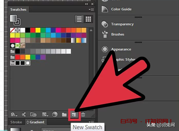 3、创建了五个形状(如上面建议的)后,创建两个色板。您可以通过以下方式执行此操作:单击色板,然后在面板菜单中单击渐变面板的右上角。出现对话框时,只需单击新色板,然后单击确定。
