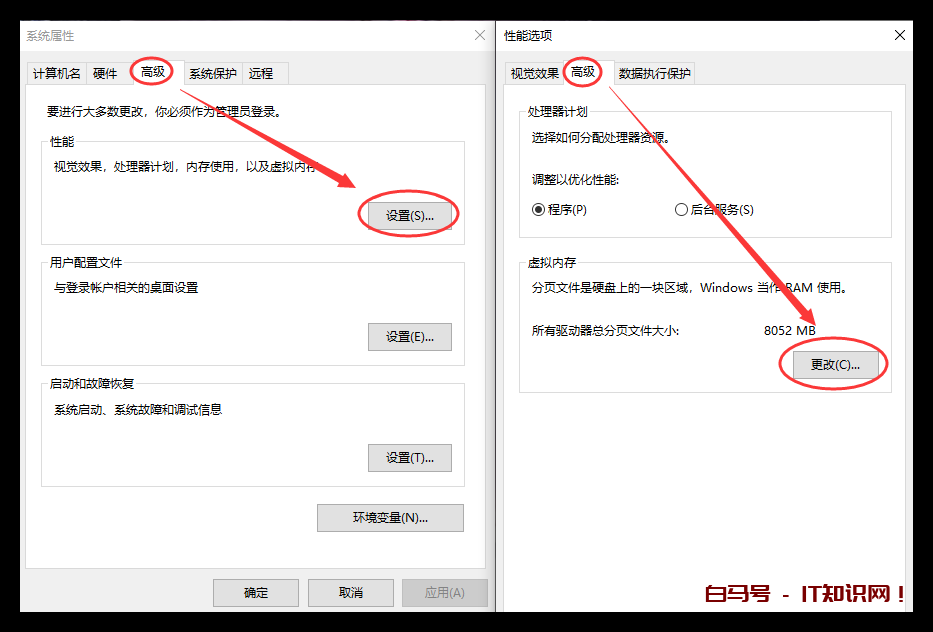 在系统属性窗口,点击「高级」-「设置」;打开性能选项窗口,点击「高级」-「更改」。
