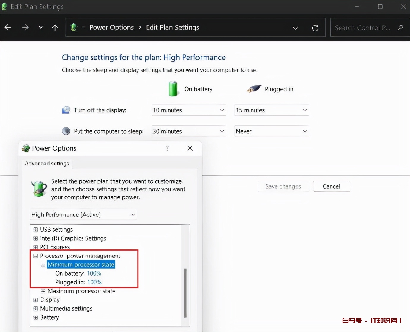 4.本页转到处理器电源管理,并确保最高和最小化处理器状态为100%。