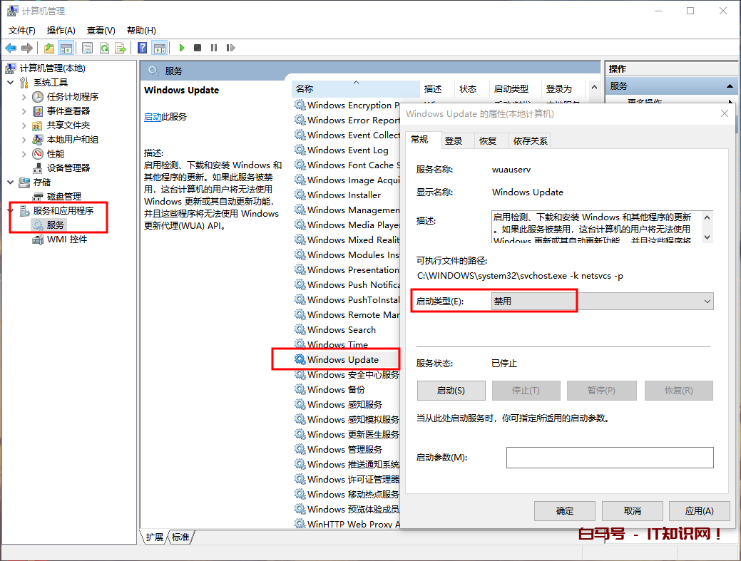 鼠标右击「此电脑」,并点击「管理」进入计算机管理页面,找到“服务和应用程序”并打开选择程序并进入,找到“Windows Update”,右击选择属性并将启动类型改为“禁用”,最后点击确定。