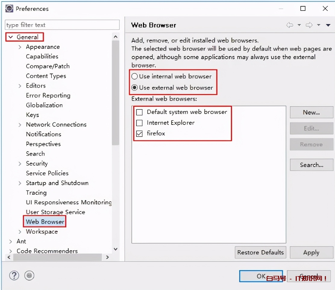 默认情况下,Eclipse使用的是内部浏览器。但也可以指定为外部浏览器。