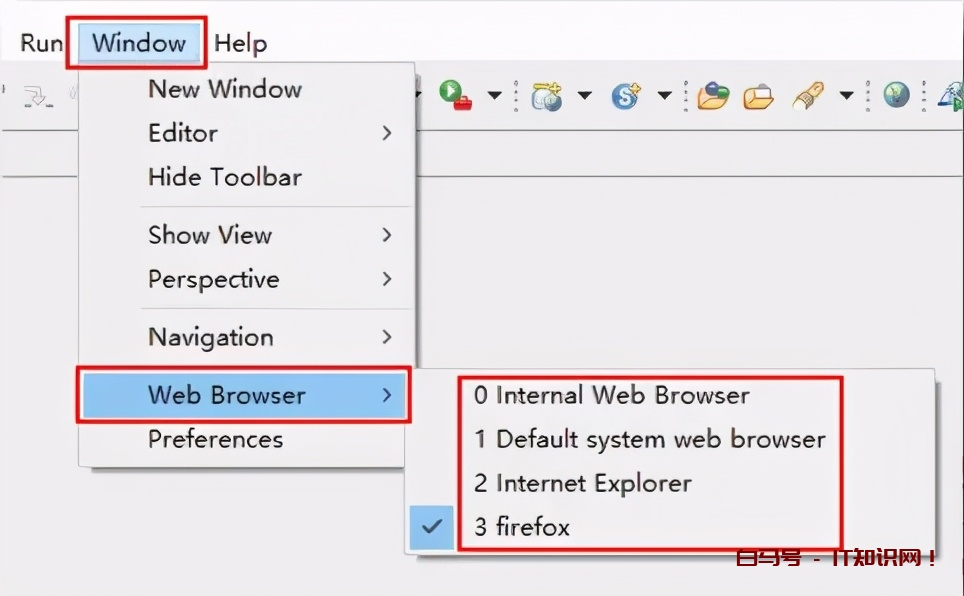 通过Eclipse的菜单选项也可以方便的切换默认浏览器,在菜单栏Window/Web Browser下可以直接切换。