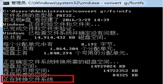 4、回车后,我们会看到当前U盘的一些信息,同时提示正在转换文件系统。