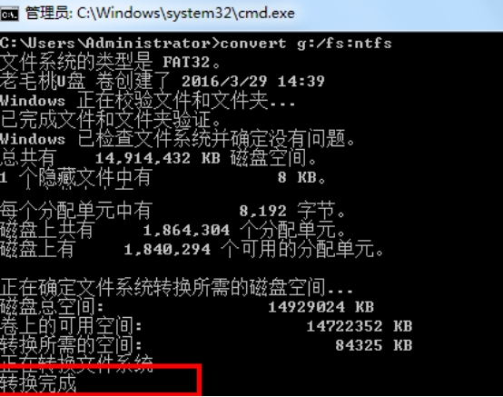 3、在弹出的命令提示窗口中输入’convert g:/fs:ntfs’并回车确定。(g:/代表U盘所在盘符)