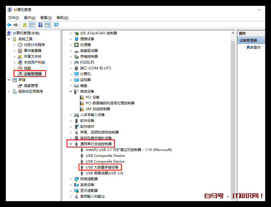 依旧是先进入到「计算机管理」界面,点击「设备管理器」,找到「通用串行总线控制器」,双击「USB大容量存储设备」。