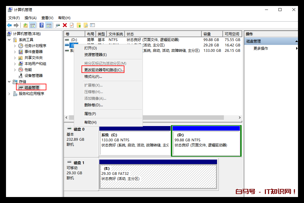 进入到「计算机管理」界面,在右侧「存储」-「磁盘管理」,找到「可移动磁盘」,并击选择「更改驱动器号和路径」。