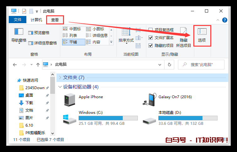 很有可能是U盘在你的电脑上被隐藏了,将U盘插入电脑后,打开「此电脑」,点击「查看」-「选项」。