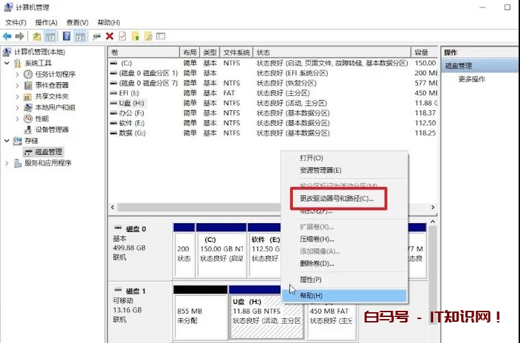 在磁盘管理页面,右键U盘,点击【更改驱动器号和路径】-【更改】。