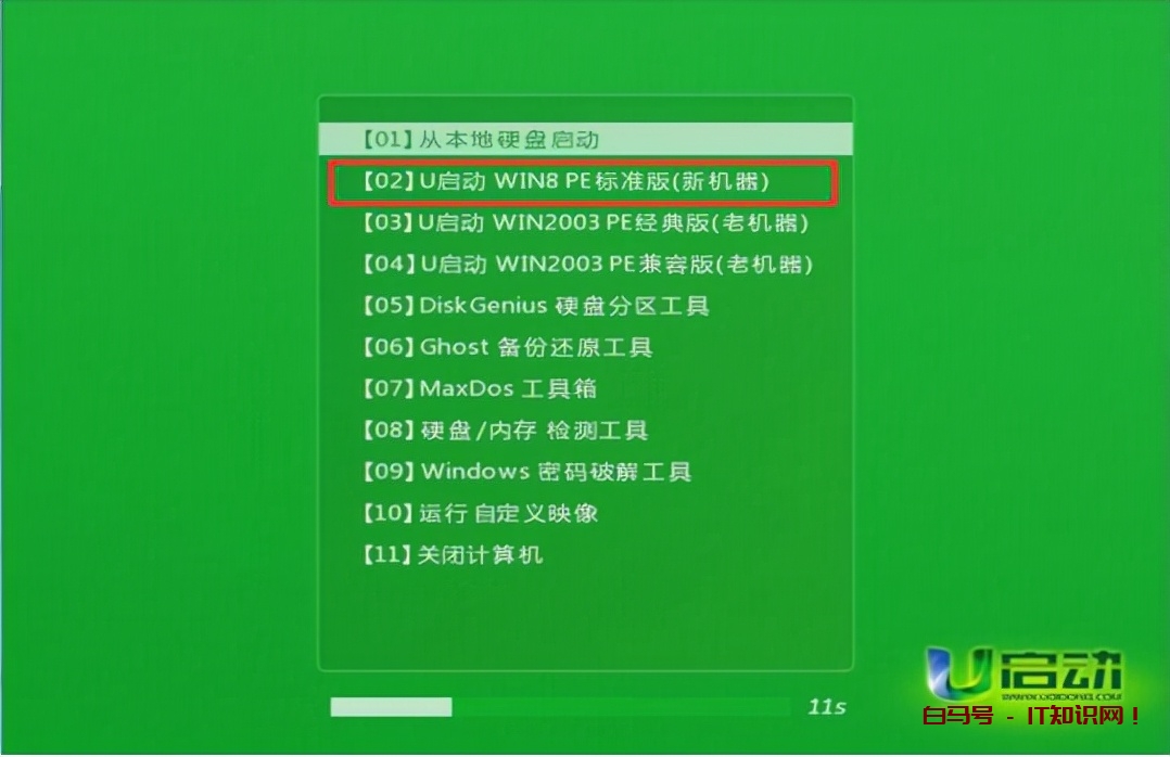 进入pe模式之后,系统会跳出u启动主菜单界面,选择第二个选项【u启动 win8 pe标准版(新机器)】,如果是老式电脑请选择03或04的选项。