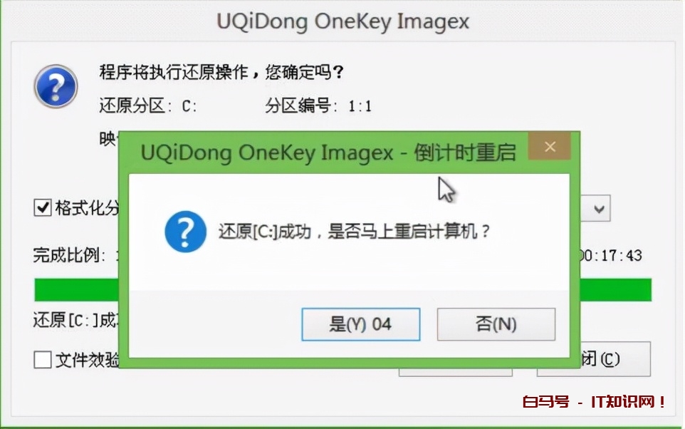 3、还原的过程需要一些时间,请勿拔插U盘,耐心等待。还原结束后系统会弹出“是否马上重启计算机”,点击【是】并快速拔出U盘;如图所示: