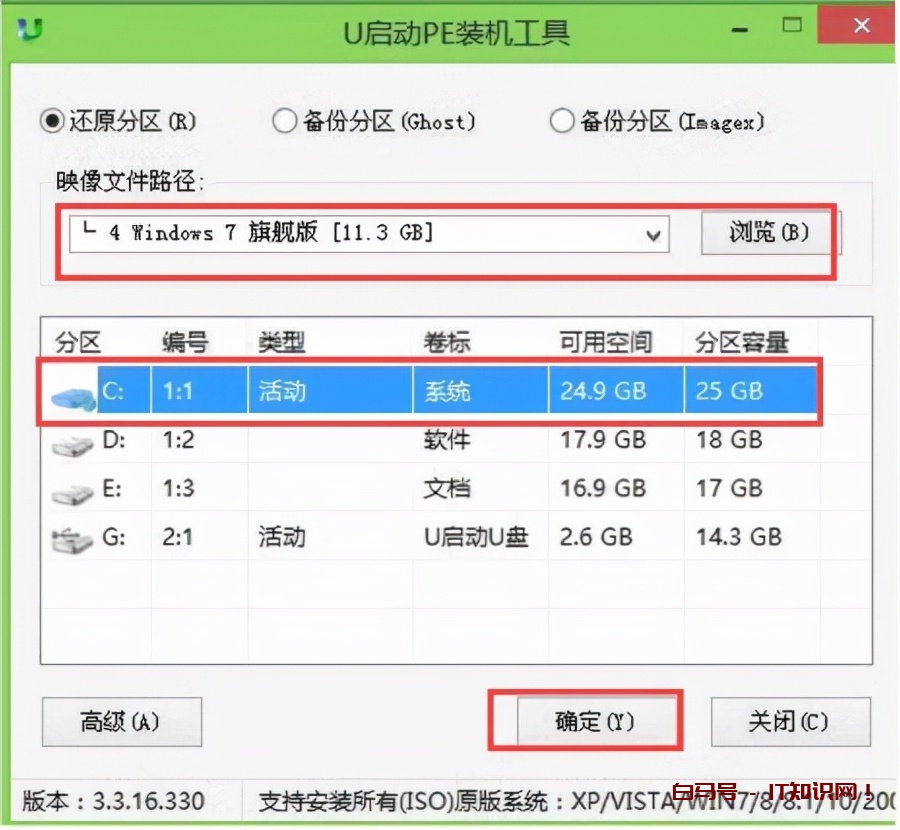 1、进入pe工具之后,系统会自动跳出pe装机工具,并且识别u盘中的系统镜像文件。一般我们选择C盘(系统盘),选择完成之后点击【确定】