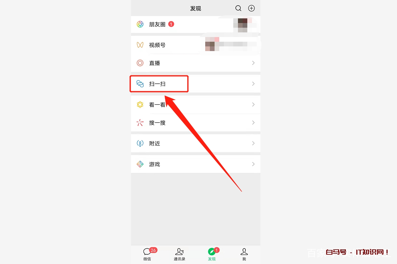 保存好这张照片以后,用户打开自己的而微信,点击微信界面下方的发现,然后找到“扫一扫”功能,并点击。如下图: