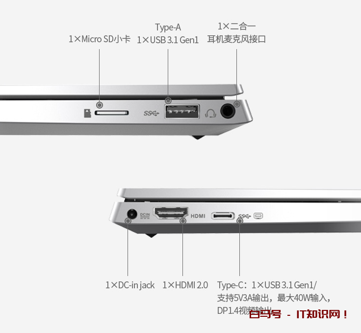 接口方面,具有一个Micro SD插槽,一个USB,一个HDMI,一个Type-C,以及耳机和麦克接口。具有53.2Wh电池,重量1.4Kg,预装Windows 10系统。