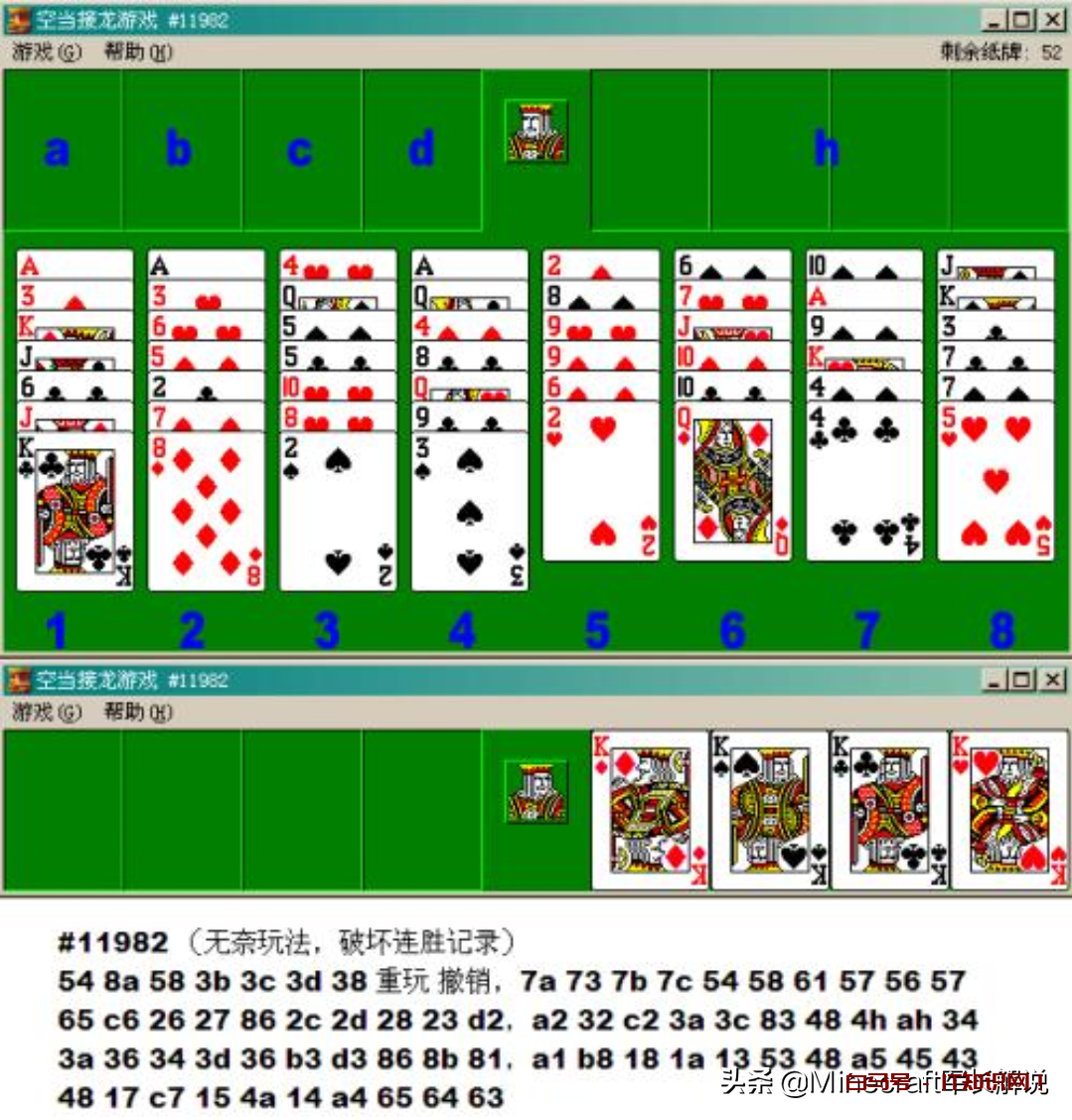 就这样,11982吸引了无数空当接龙玩家。尽管常有人报告说攻破了11982局,但其实都是用作弊的手法。