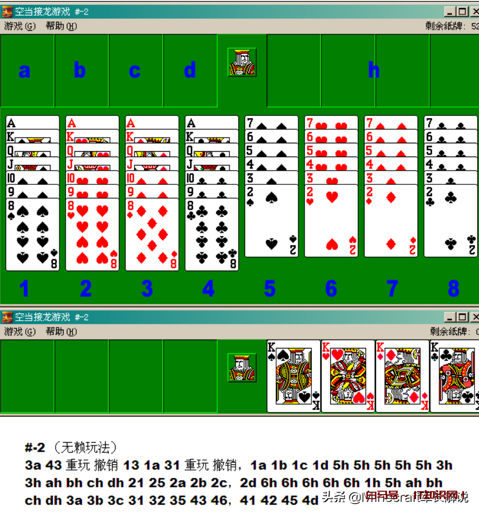 我在之前就已经说过了,空当接龙有4个隐藏关卡,其中-1和-2无解。为何无解呢?这就要从这两个牌局的排列说起了,通过观察-3和-4两局中的牌序排列之后,我们大致可以知道这两局随便点一张牌就可以过关的原因了,因为这两局中的例如J、Q、K之类的大牌都压在了最底下,而A、2、3这样的小牌都在最前面,而且这是顺序排列的牌局。因为在观察-4和-3局中我们发现A、B、C、D、E、F、G、H八列中纸牌从上到下的排列顺序呈递减趋势的一个同花色等差数列,例如-4和-3中的A列的从上到下的排列就是黑桃花色K、J、9、7、5、3、A和K、Q、J、10、9、8、7,B、C、D列也是这样同花色排列的,而E列的从上到下排列则是黑桃花色的Q、10、8、6、4、2和6、5、4、3、2、A,F、G、H列也是按照同花色顺序排列的;这就是-4和-3局,而-2和-1局的牌局排列发生了微小的改变,在-4和-3局中,四个A的位置在E、F、G、H的倒数第一列,而回收单元的回收顺序中,A是最小的一张牌,而-2和-1则中的A在A、B、C、D列的第一行,而-1局中的变化就更大了,因为在-1局中的A、B、C、D四列中纸牌从上到下的排列顺序呈增减趋势的一个同花色等差数列。
