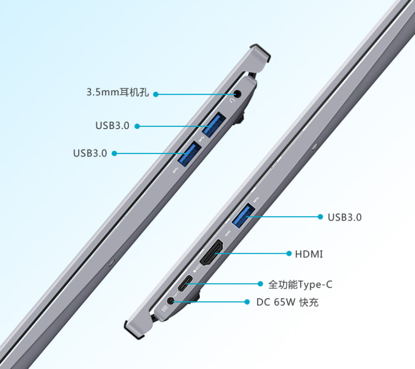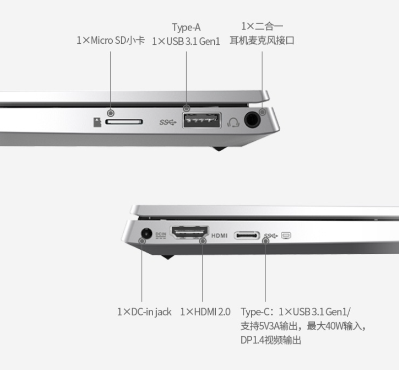 接口上比较少,有一个USB,一个Type-C,电源接口,小卡插槽,还有HDMI 2.0。支持WiFi 6,蓝牙5.0,具有53.2Wh电池,重量1.39kg。系统为Windows 10,不带Office。