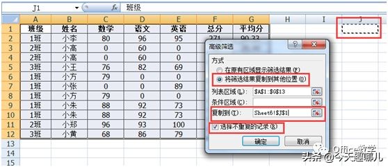 步骤 2 、在跳出的高级筛选框中,选择 [ 将将筛选结果复制到其他位置 ] ,然后鼠标点击 [ 复制到 ] 的方框,定义删除重复项后,表格要放在单元格的位置。此时我们可以定义放 J2 单元格的位置,即鼠标点击一下 J2 单元格,就可以看到复制到哪的方框就显示我们定义的位置,在把 [ 选择不重复的记录 ] 打勾;具体如下图: