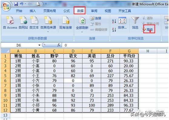 步骤 1 、选中表格,选择菜单 [ 数据 ]-[ 高级 ] ,