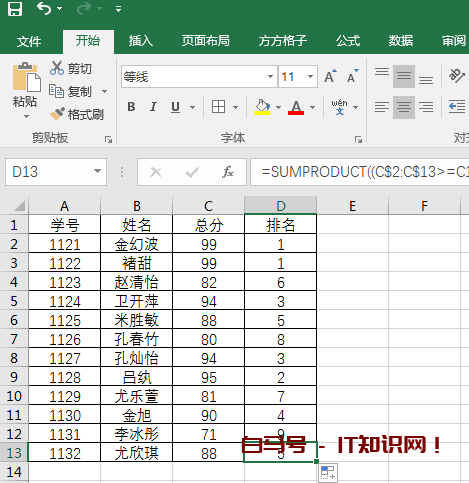 接着我们看看【(C$2:C$13>=C2)】这一部分,它的作用是判断C2:C13单元格区域中的成绩是否大于等于当前的C2成绩,如果成立返回TRUE,否则返回FALSE。返回结果为{TRUE;TRUE;FALSE;FALSE;FALSE;FALSE;FALSE;FALSE;FALSE;FALSE;FALSE;FALSE}