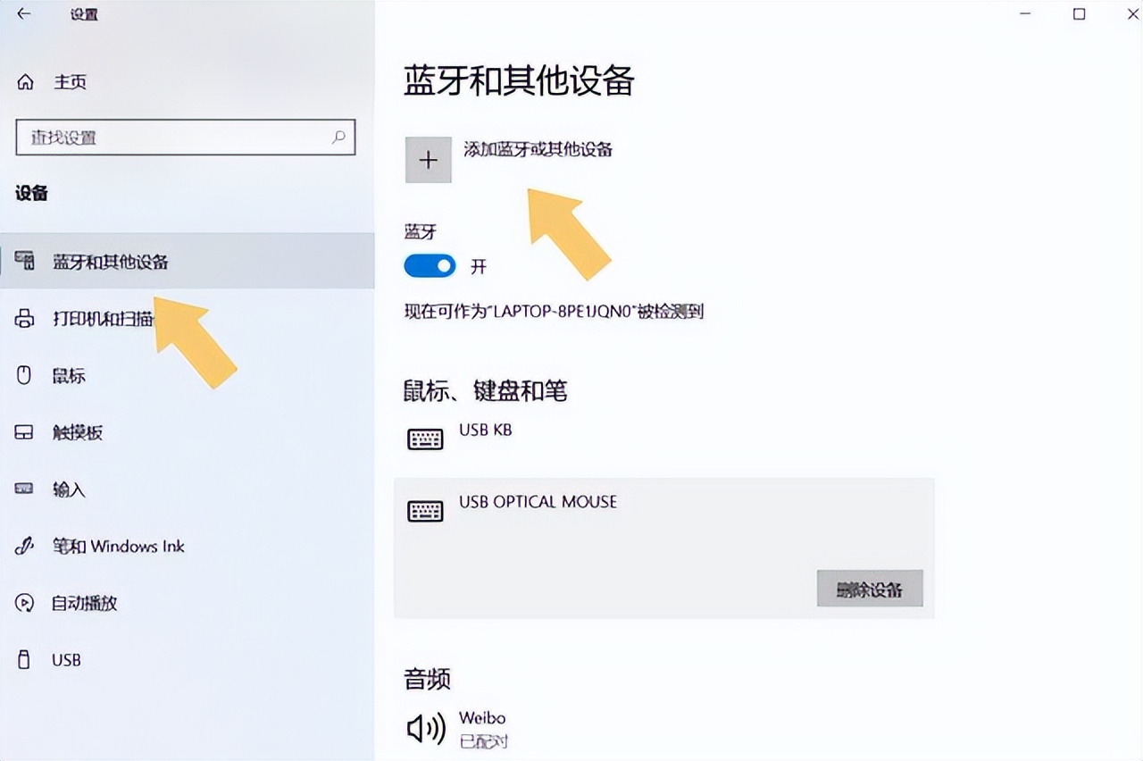 进入“设备”选项后,在弹出界面的左侧选择“蓝牙和其他设备”,然后再选择“添加蓝牙和其他设备”。如下图: