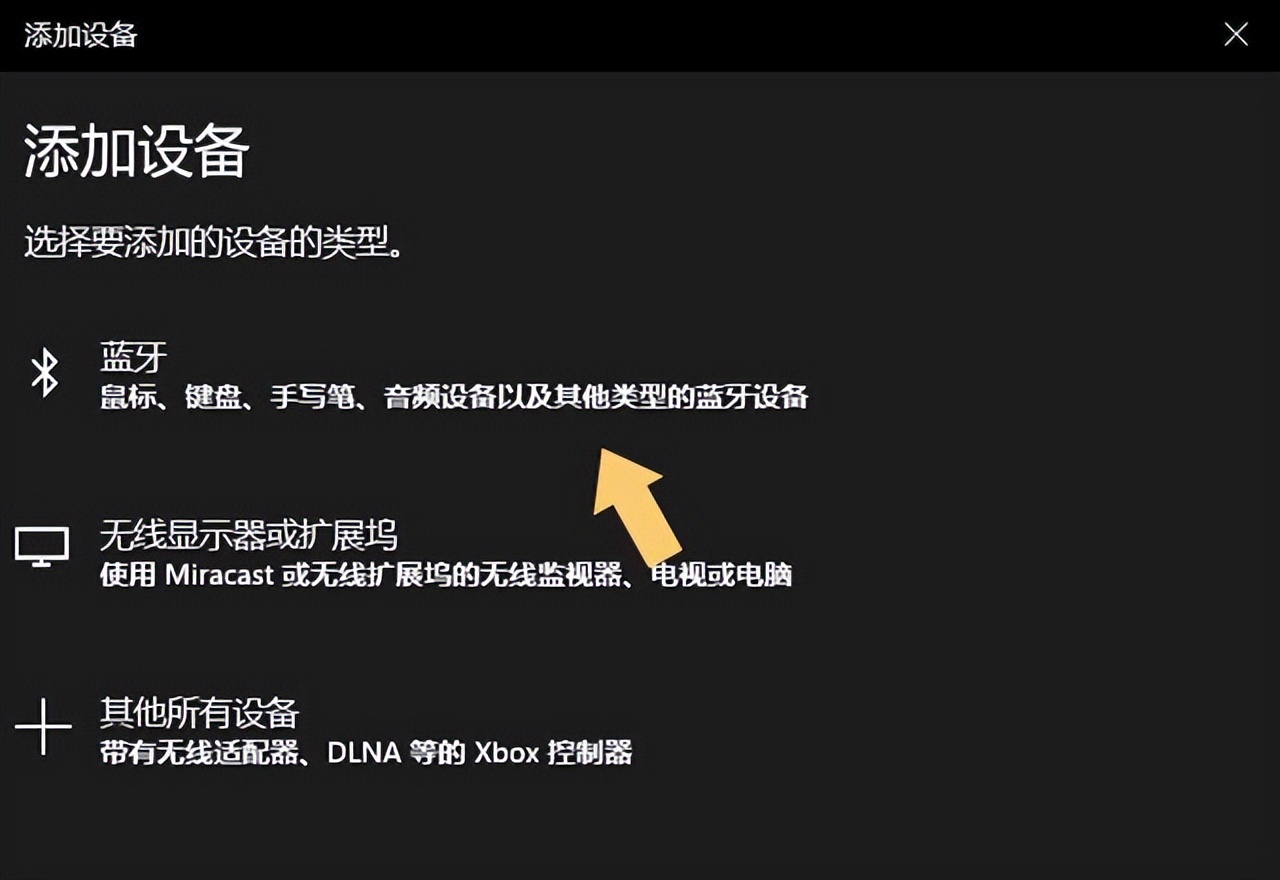 选择该选项后,会弹出一个界面,基于添加的蓝牙设备的不同,选择的选项也有区别,因为要搜索蓝牙鼠标,直接选择第一项“蓝牙”即可。如下图: