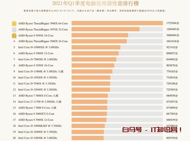如今DIY早一步是当年的热度,如果贸然问您现在最强的民用CPU是那款,估计老玩家都要想半天也未必说出正确答案。今天鲁大师发布2021年Q1季度电脑处理器性能排行榜,AMD Ryzen Threadripper 3990X名列第一,该处理器其实已经蝉联第一两年之久。