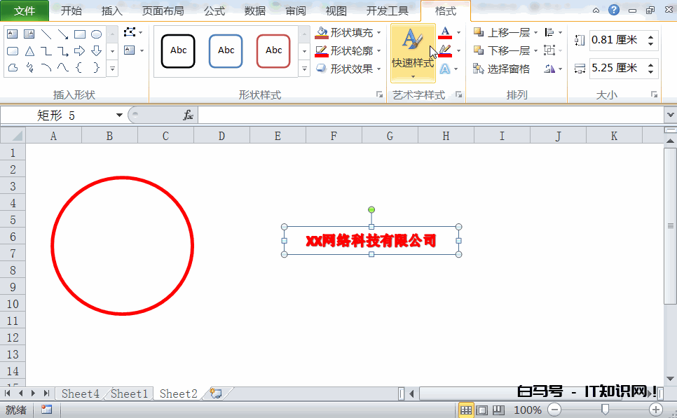 第2步:我们画出适合大小的圆形后,并设置好填充颜色及边框线条后,再点击菜单栏:插入—文本—艺术字,将我们需要添加的公司名称等文字添加并调整为合适的大小。同时将字体颜色和文字边框的颜色修改为红色。最后将文本框边框更改为:无线条,这样就可以只显示文字内容。如下图所示:
