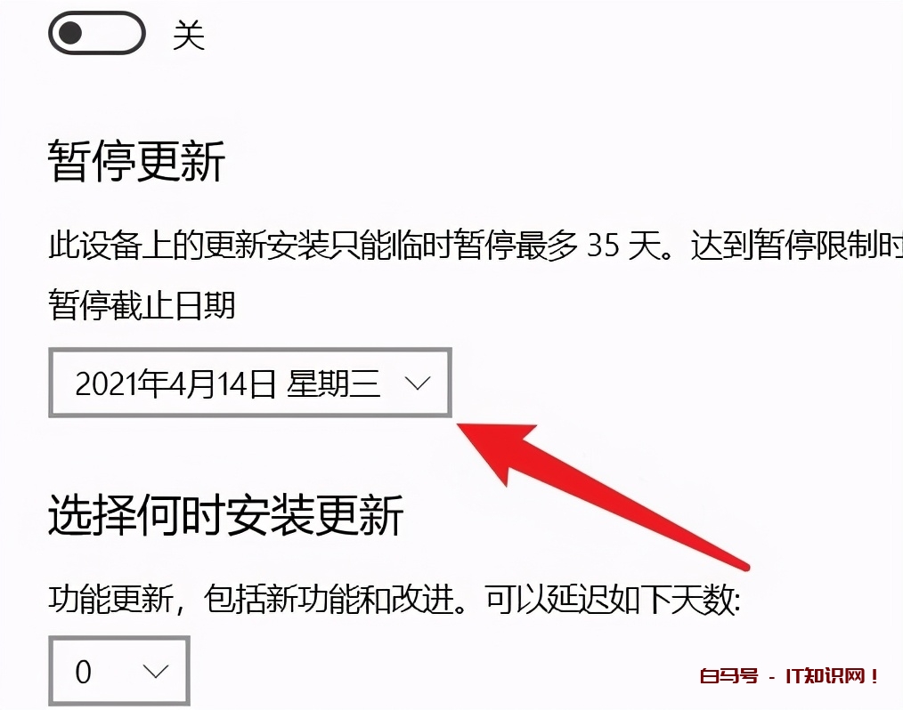 5、最后我们将电脑上的更新安装临时暂停最多35天。如果下次达到暂停限制时,就需要先将电脑更新后,然后才能再次暂停。