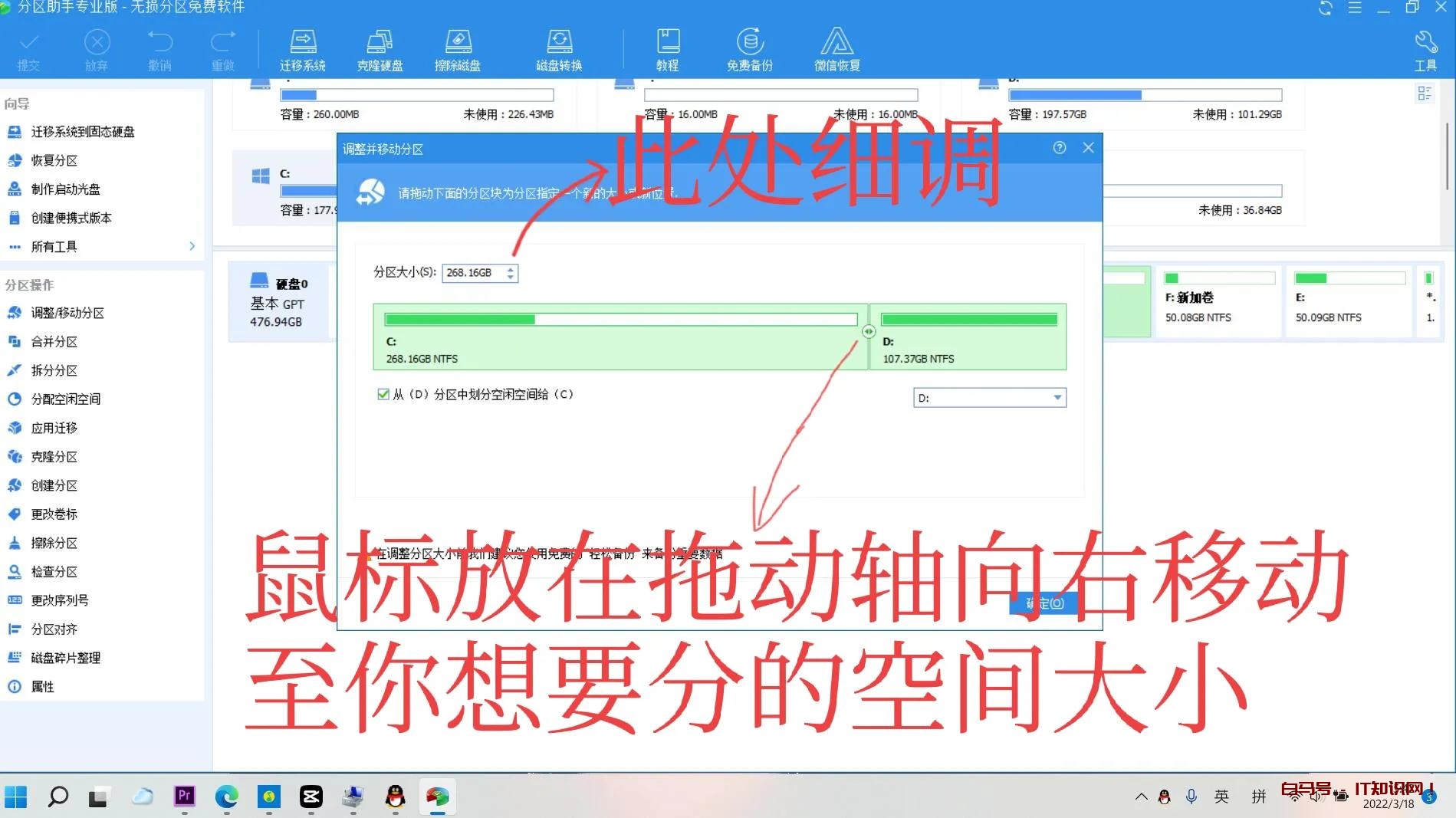 6:鼠标放在拖动轴向右移动至你想要分的空间大小,左上角细调。但不可能是整数的只能是1024的倍数