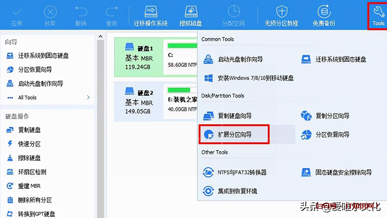 2.我们将下载好的傲梅分区助手打开,点击界面上的“Tools”(工具),再点击“扩展分区向导”,如下图所示。