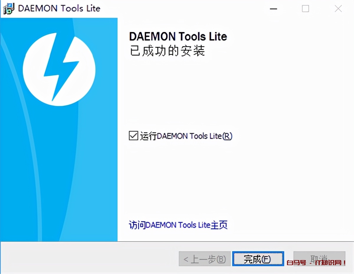 7、Daemon Tools lite(虚拟光驱)安装完成,您可以勾选软件中间位置的运行Daemon Tools lite,然后点击【完成】就可以打开软件了。