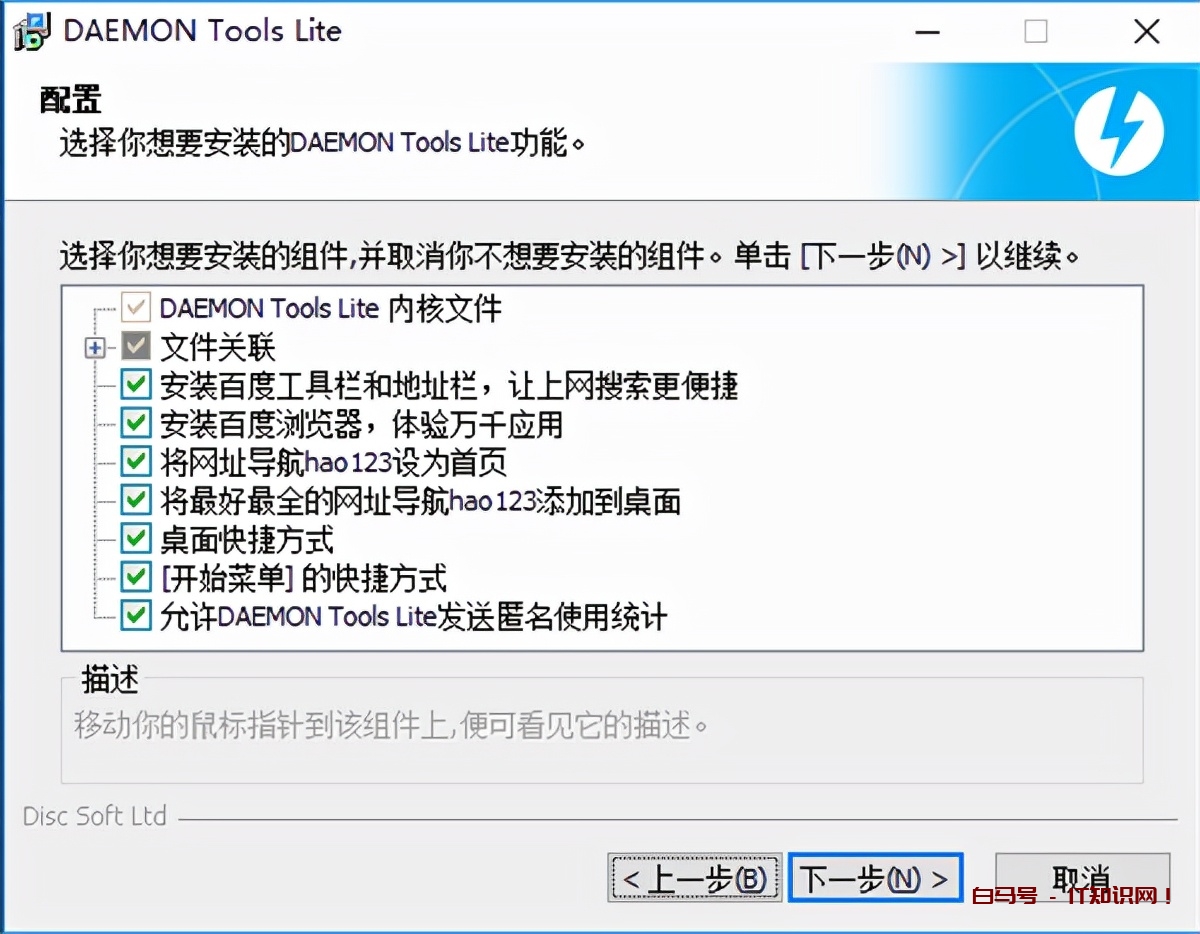 5、选择Daemon Tools lite(虚拟光驱)安装组件,取消您不想要的安装组件,将安装组件前的√去掉就可了。选择完成后点击【下一步】。