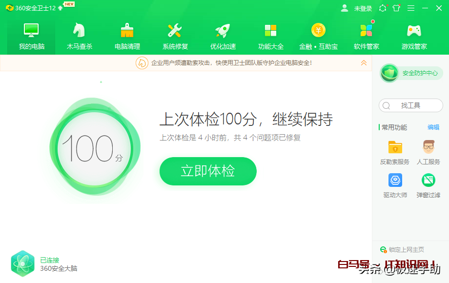 如果方法二也不能解决问题的话,那么此时我们可以找个Windows清理助手对电脑进行清理,然后用金山或者是卡巴斯基等杀毒软件来对电脑进行查杀,因为设备可能被病毒入侵了,最后查杀过应该就可以正常打开360安全卫士软件了。