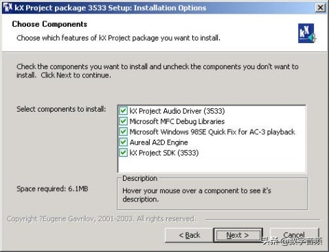 在这里,大家可以选择自己需要的部分释放(这里要解释一下,现在的这个安装过程实际上是驱动程序包的一个解压过程,并不是驱动程序的安装过程,相信安装过Sound Forge的同学都能想起来,都是类似的),没有安装过kX驱动的同学请全部选择,选定后点击Next继续。