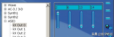 这个ASIO输入端口能够完成16通道的ASIO输入连接,需要注意的是KX驱动并不同时都打开这些ASIO端口,需要到KX ASIO设置窗口打开这些ASIO端口!根据不同的电脑配置,采样率的设置可以自行调节,采样率越低,延迟越低,但出现的暴音就可能大;采样率越高,延长越高,但声卡越稳定。调整以播放不出现暴音为前提。为了不过多地占用资源,我们一般选择有2进2出的ASIO端口就可以了(在kx管理器“设置”内的“ASIO控制面板”里设置即可),如图: