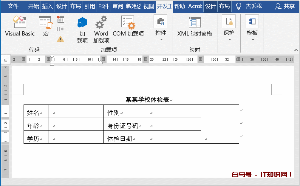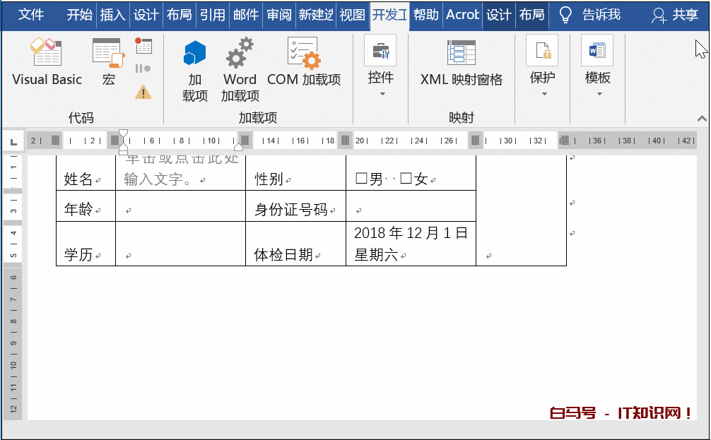 将光标定位在性别所在位置,然后点击【开发工具】——【复选框内容控件】,如果你选中之后发现是☒,这时可以选中属性,更改复选框选中的符号即可。