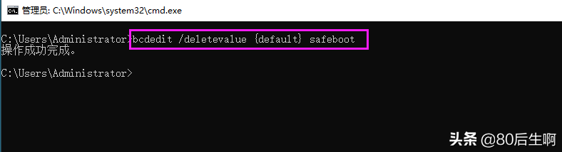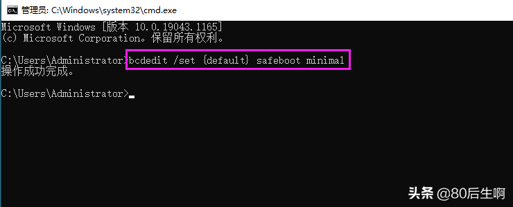 在弹出的CMD命令窗口,输入bcdedit /set {default} safeboot minimal并回车,提示操作成功后重启。