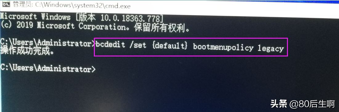 在弹出的CMD命令行窗口,输入bcdedit /set {default} bootmenupolicy legacy并回车,提示操作成功后重启,